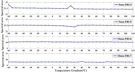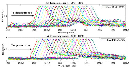 The reflection spectra acquired from the temperature experiment are used to analyze the influence of temperature on the spectral area. The reflection spectra of some FBG sensors during the experiment are shown in Figure 9. The grating lengths of FBG5 and FBG6 are 5 mm and 10 mm, respectively. The data were collected every 5 °C in a temperature range from −60 °C to +110 °C. The experimental data of these sensors are affected by temperature loadings and noise interference. The original reflection spectra of the FBG sensors are narrow-band Gaussian envelopes. With the increase in temperature (from −60 to +110 °C), the reflection spectra shift towards long wavelength direction, and the reflection spectra were not distorted. There is no multi-peak phenomenon in the reflection spectra. The reflectivity and bandwidth of the reflection spectra have almost no variation.