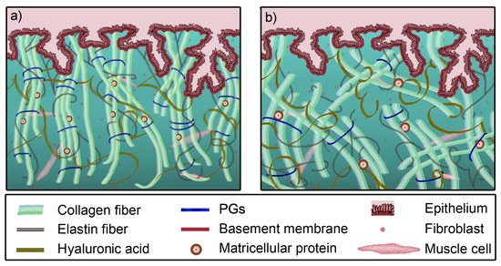 The gelatinous matrix is a ground material composed of water, proteins and PGs. PGs fill the spaces between the fibers in a perpendicular scattered network, conferring a supportive bending stiffness to collagen. At the same time, they contribute to resisting compression forces along with the interstitial fluid, balancing the fiber network [40]. PGs are composed of a core protein that covalently bonds with glycosaminoglycans (GAGs), thereby becoming a scaffold for the loose proteins of the ECM. Some of them can interlace their core with collagen, affecting the fibrillogenesis [41] and providing lateral stability [42,43]. GAGs are polysaccharide macromolecules with high electrical charges; among them, there is a particular GAG called hyaluronic acid, which is able to imbibe the surrounding elements. This is a hydrophilic process that attracts water, generating osmotic pressure, turning these components into a dampener against compression [44].