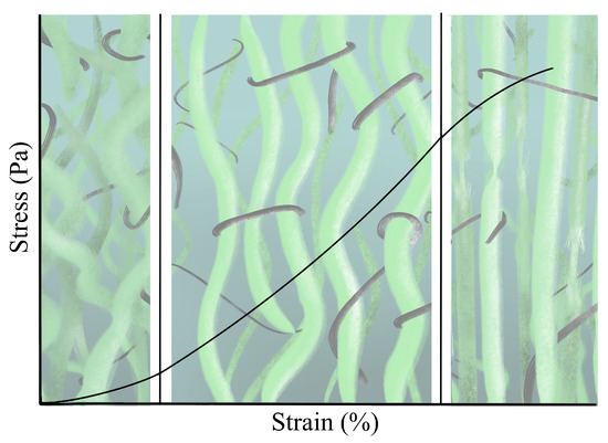 The heterogeneous combination of the ECM components exhibits directional anisotropy, which is mainly attributed to variations in the morphology of the crosslinked fiber network [45]. Consequently, the stress at a point does not depend only on the gradient of deformation but also on the orientation, connection and distribution of its components. At the same time, the fiber network displays a nonlinear stress–strain relationship due to complex interactions that vary from point to point. The action of collagen and elastin can be lumped together, showing a stress–strain behavior divided into three regions (see Figure 2) [46]: (i) In the absence of load, collagen fibers are in their natural state of formation, wavy and loose. Due to its symmetrical organization, its behavior is frequently modeled as approximately isotropic. For strains lower than 2%, collagen offers little resistance, originated by fiber bending; thus, it is considered that elastin absorbs most of the energy, acting as a spring. This is the area with normal physiological activities called the toe region, showing nonlinear effects [47]. (ii) The progressive increase in deformation will disrupt the fibers that begin to line up in the direction of the load increasing the stiffness; this in turn, means that crosslinks are stressed and interfibrillar sliding is induced; the stress–strain relationship is approximately linear. (iii) At around 30% strain, depending on the tissue, crimping disappears and the fibers are arranged in parallel; the tissue reaches its highest stiffness [48,49,50]. Beyond these values, crosslinks and fibers begin to break, leaving severe damage to the tissue.