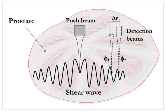 As for the viscoelastic characterization of human prostatic tissue, few studies based on ultrasound elastography have addressed the issue. Shear wave dispersion ultrasound vibrometry (SDUV), one of the few techniques that has been used in the prostate, consists of monitoring the propagation of the shear wave by a separate ultrasound detector and reconstruction of the wave speed from two different phases [98] (refer to Figure 3 for an illustrative example of the principle). The in vitro study of Mitri et al. [101] used a KV model aimed at the characterization of the mechanical shear parameter for frequencies between 50 and 400 kHz. They obtained shear elastic modulus values of 1.31–12.81 kPa and viscosity values between 1.10 and 6.82 Pa.s. These data proved the viscoelastic nature of the properties of prostatic tissue.