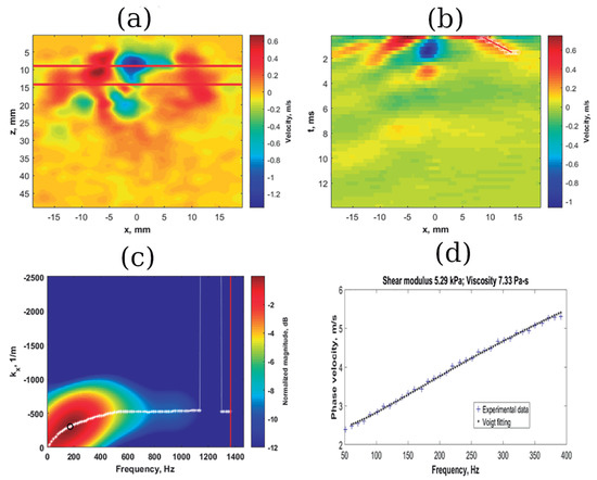 An illustrative process for the estimation of the viscosity parameter of a malignant mass. (a,b) Maps of particle velocity; (c) a k-space map displaying the phase velocity with the energy of each frequency; (d) the final result as a dispersion curve, based on the phase velocity, which is fitted using a Voigt model for estimation of viscoelastic parameters. Source: PLoS ONE, modified from 2018 Kumar et al. [89].