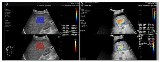 SSI was also used to staging liver fibrosis, with several studies reporting that shear wave imaging was more accurate than TE [225,226], but again, SWE can not reliably differentiate between mild stages of fibrosis. The importance of this potential biomarker has led to supersonic shear imaging (SSI) to recently release AIXPLORER MACH30® (SuperSonic Imagine, Aix-en-Provence, France) with new liver tools as the viscosity imaging feature. Figure 5 shows and imaging of a healthy liver with real-time viscosity values.
