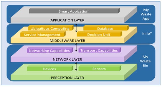 The My Waste Management system considers three main blocks, as shown in Figure 2. The first describes the smart bin, the second considers the IoT middleware integration, and the last block presents the user’s application.