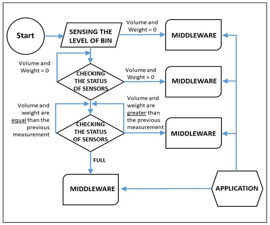 When initialized, the My Waste Bin system sends its geographical coordinates together with the date and time obtained through the satellite through the GPS module to the middleware. The weight and volume of the waste are transmitted initially as zeroes, along with the other data obtained through the sensors (temperature and the relative humidity of the air). These data are stored in the system and the compartment can already be found by the application as being able to receive waste. In the sketch of the Arduino [], a timer instruction is inserted, and cyclically executes sensing to evaluate possible changes in the status usage of the compartment. Each time the filling level and volume is changed, a new transmission is executed, sending all the data obtained by the sensors. This sensing loop runs until the compartment attains its full fill level. From that moment, the application will report this compartment as full and the user (citizen) will receive new waste disposal options through other compartments available in the area. For the concessionaires, it is already a compartment eligible for collection. Figure 4 illustrates the working flow diagram of the smart My Waste Bin.