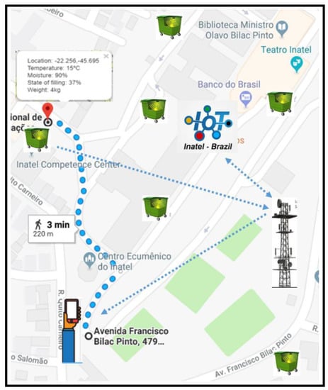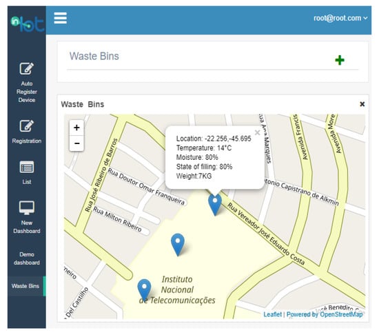 Middleware is a software that connects base systems such as IoT devices to each other and third-party applications [,]. It works as a layer of translation, allowing communication and data management for distributed applications. Within the waste management system (and other IoT systems), the middleware plays an essential role because it receives all the data sent by the containers and stores them so that specific queries executed by the application are quickly and consistently accessible to the user. In this case, the middleware used was In.IoT [,], which also allows users to visualize the waste bin status in real-time via the Web. A screenshot of the In.IoT middleware platform, presenting the location of smart bins around the urban region where the solution is used, is shown in Figure 5.