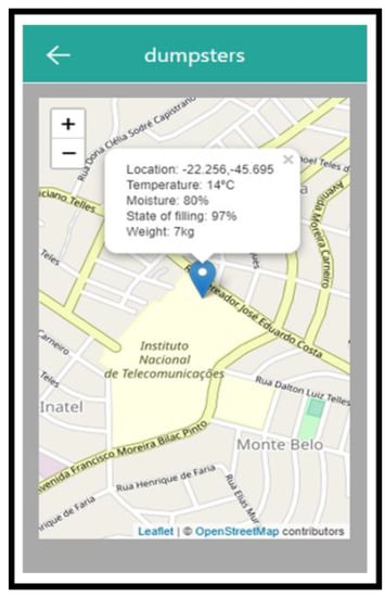 The system can also be accessed through a Web browser [], a way for the garbage collection agencies to obtain information on filling of the containers and thus to plan their collection routes in an optimized and pre-scheduled manner, as well as facilitating the insertion of data to be made available to users, such as the collection schedule or out-of-service notifications for maintenance purposes. The system also allows the estimation of places with higher demand for use, which allows the allocation of new collection containers in the areas, with applications responding quickly to the users’ needs. Figure 6 presents a view of My Waste App.