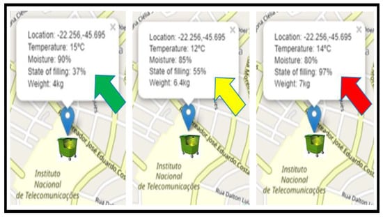 Many research projects related to waste management are present in the literature. Saha et al. [] brings a concept of intelligent disposal through a design that uses solar energy to feed the system and presence sensors for monitoring the amount of waste accumulated inside the enclosure. If necessary, the compartment can perform the compaction of the waste so that its volume can be reduced by up to 10 times, even before collection. Information about the fill level is sent via wireless communication to a cloud server where it is stored. The smart bin can act as a Wi-Fi hotspot, and it is easily adapted to any type of container, from small containers to large garbage containers such as underground containers. In turn, concessionaires access the system through a login and have access to data analysis, allowing fill level monitoring of smart bins, in real time, with notifications of need for collection through information that contains optimized routes for waste collection. This intelligent solution helps utilities reduce truck fleet, reduce fuel consumption, and maximize pick up time, minimizing operating costs by up to 80%.
