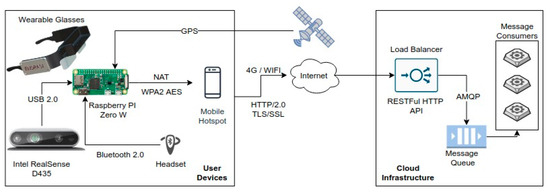 The architecture of the cultural navigation module of the proposed VPS, consists of four components; a stereoscopic depth-aware RGB camera, a BCU, a wearable Bluetooth speaker device, and cloud infrastructure. The first three components are mounted on a single smart wearable system, with the shape of sunglasses, capable of performing lightweight tasks, such as risk assessment, while the computationally intense tasks, such as object detection and recognition, are performed on a cloud computing infrastructure. These components are further analyzed in the following Section 3.1 and Section 3.2.
