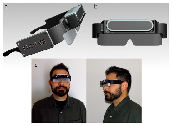 Figure 2. 3D representation of the smart glasses. (a) Side view of the glasses; (b) front view of the glasses; and (c) 3D-printed result with the actual camera sensor. In this preliminary model, the glass-part was printed with transparent PLA filament, which produced a blurry, semi-transparent result. In future versions, the glass-part will be replaced by transparent polymer or glass.