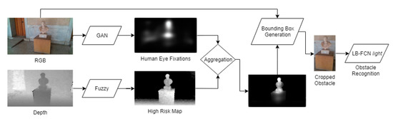 The novel approach followed by the object detection module employs fuzzy sets along with human eye fixation prediction using GANs and enables the system to perform efficient real-time object detection with high accuracy prevailing in current state-of-the-art approaches. This is achieved by incorporating depth-maps along with saliency maps. The module is capable to accurately locate an object that poses a threat to the person navigating the scenery. For the object recognition task, the proposed system incorporates deep learning to recognize the objects obtained from the object detection module. More specifically, we use the state-of-the-art object recognition CNN, named LB-FCN light, which offers high recognition accuracy with relatively low number of free parameters. To train the network, a new dataset was created, named “Flickr Obstacle Recognition” dataset, containing RGB outdoor images from five common obstacle categories.