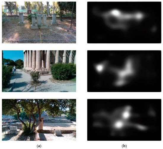 The saliency maps used in this work are generated by a GAN [47]. The generated saliency maps derive from human eye fixation points and thus, they make the significance of a region in a scene more instinctual. Such information can be exploited for the obstacle detection procedure, and at the same time, enhance the intuition of the methodology. Additionally, the machine learning aspect enables the extensibility of the methodology, since it can be trained with additional eye fixation data, collected from individuals during their navigation through rough terrains. An example of the saliency maps estimated from a given image can be seen in Figure 4. Since the model is trained on human eye-fixation data, it identifies as salient those regions in the image on which the attention of a human would be focused. As it can be observed in Figure 4, in the first image, the most salient region corresponds to the fire extinguisher cabinet; in the second image, to the people on the left side; and in the last image, to the elevated ground and the tree branch.