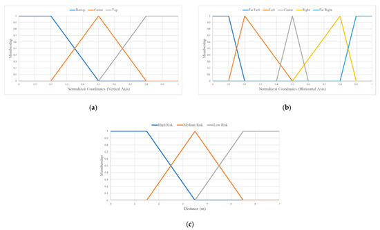 Figure 6. Membership functions of fuzzy sets used for the localization of objects in the 3D space using linguistic variables. (a) Membership functions for far left (h1), left (h2), central (h3), right (h4) and far right (h5) positions on the horizontal axis. (b) Membership functions for up (v1), central (v2) and bottom (v3) positions on the vertical axis. (c) Membership functions for low (r1), medium (r1), and high risk (r3) upon the distance of the user from an obstacle.