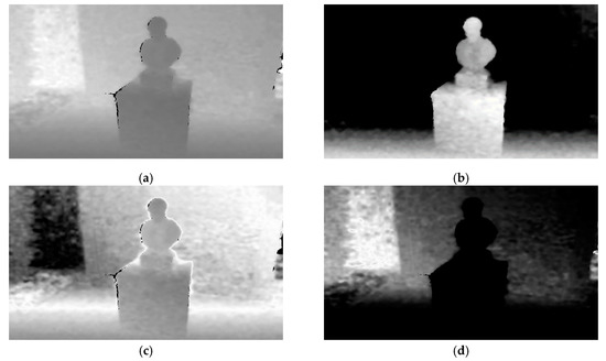 Figure 7. Example of R M i creation. (a) Depth map D, where lower intensities correspond to closer distances; (b) visual representation of R M 1 representing regions of high risk; (c) R M 2 representing regions of medium risk; (d) R M 3 depicting regions of low risk. Higher intensities in (b–d) correspond to lower participation in the respective fuzzy set. All images have been normalized for better visualization.