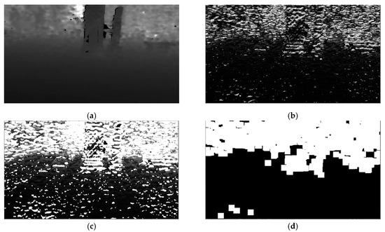 Figure 9. Example of the creation steps of GM. (a) Depth map D, normalized for better visualization; (b) visual representation of the difference map ΔM; (c) difference map ΔM after the application of the basic morphological gradient; and (d) the final ground removal mask GM.