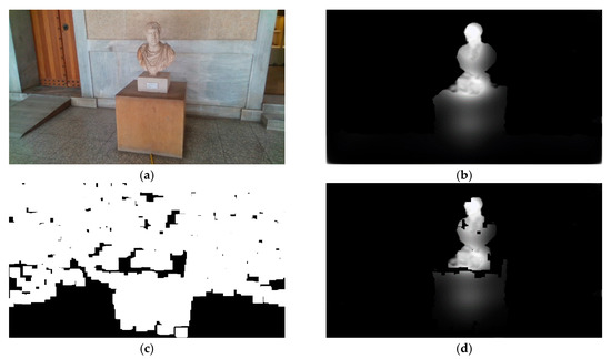 Figure 10. Example of the ground removal procedure. (a) Original IRGB image; (b) corresponding obstacle map O M 1 ; (c) respective ground removal mask GM; (d) masked obstacle map O M 1 . In (d), the ground has been effectively removed.