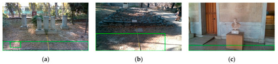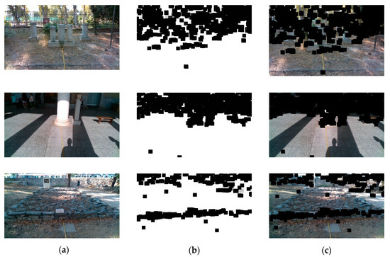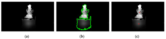 where q = 0, 1, 2, …, k = 0, 1, 2, … and x, y denote image coordinates along the x-axis and y-axis respectively. An example of the obstacle boundary detection can be seen in Figure 11, where the boundaries of the obstacles are illustrated with green lines (Figure 11b) and the centers of the obstacles are marked with red circles (Figure 11c).