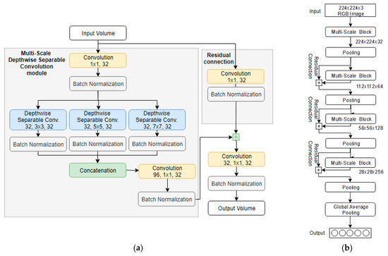 For the object recognition task, the LB-FCN light network architecture [45] was chosen, since it has been proven to work well on obstacle detection-related tasks. A key characteristic of the architecture is the relatively low number of free-parameters compared to both conventional CNN architectures, such as [40], and mobile-oriented architectures, such as [41,42]. The LB-FCN light architecture uses Multi-Scale Depth-wise Separable Convolution modules (Figure 12a) to extract features under three different scales, 3 × 3, 5 × 5, and 7 × 7, which are then concatenated, forming a feature-rich representation of the input volume. Instead of conventional convolution layers, the architecture uses depth-wise separable convolutions [43], which drastically reduce the number of free-parameters in the network.
