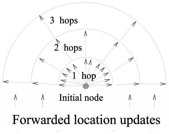 Figure 2 also highlights the fact that the greater the distance from the node emitting the location update is, the longer the period of time between two location updates. However, for most applications (including routing), the greater the distance between two nodes is, the less accurate the knowledge of the other node’s position is. Most of the time, an approximate position is more than enough, the accurate location of the destination node becoming increasingly important as a data packet gets closer to the destination node. As a result, only significant changes in node locations should be reported, and this is exactly what the semiflooding location service does.