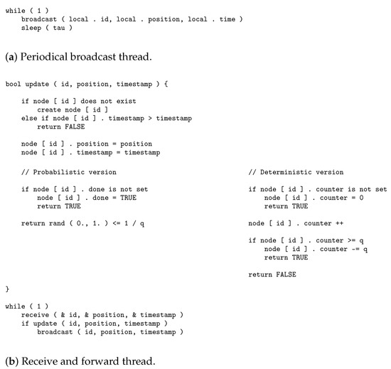 The main idea of the semiflooding location service is as follows. All nodes in the network periodically broadcast a packet containing their location information with the time when the location was issued. Nodes do not need to be synchronized for this operation, i.e., all nodes’ internal times do not need to be aligned to a single time reference, and location packets can even be broadcast at different updating rates if needed. When a node receives a location packet, it first compares the timestamp in the location packet with the one stored in the node’s location table. If the incoming information is older than or equal to the locally stored one, the incoming packet is discarded. Otherwise, the new location information is saved, replacing the former information, and 1 in q, the packet is forwarded to the neighbors. The way parameter is used is twofold. On the one hand, can be seen as a probability, in which case a random generator can be used to determine whether the packet has to be forwarded. If the value returned by the (pseudo)random generator is smaller than , the packet is forwarded; otherwise, it is not. On the other hand, can be understood as a threshold for deterministic forwarding. For example, if , only one packet in three is forwarded, i.e., the first two are not forwarded, while the last one is. The value for q is not necessarily an integer and could be any real number greater than 1. The closer to 1, the higher the frequency of packet forwarding.
