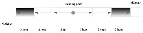For the highway scenario, nodes were assumed to be located on a rectangle of which the width was the width of the road, and the length was infinite. The width of the road was small compared to the broadcast range, and it was acceptable to consider that the nodes were on a line. In this case, our model was a line with node density , expressed in vehicles per meter. Since all nodes at distance j were in a segment, starting from the position of the farthest node at distance from i, nodes at distance j were in a segment of length R. Thus, the mean number of nodes at distance j is the mean number of nodes in a segment of length (one segment to the right of i and one segment to the left of i).