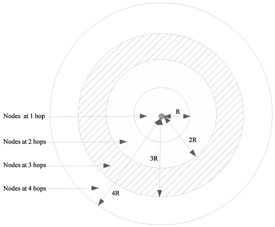 Figure 4 shows the location of nodes at n hops according to the hypotheses above. For example, the grey rectangles, i.e., those at a distance between and from the center (i.e., node i), show the location of nodes at three hops.