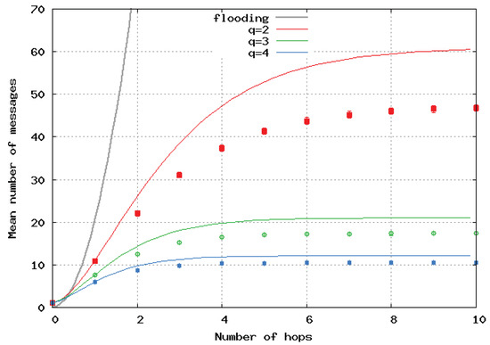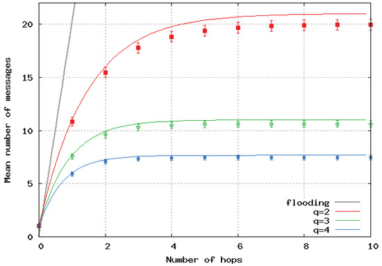 Figure 6 presents the mean number of broadcast messages per location update versus the maximal path lengths computed by the analytical model and simulations in the case of a homogeneous linear (1D) network. Analytical results are represented by a continuous line, and simulation results by dots and error bars. The same color is used for the same value of q for the simulations and the analytical model. We observed very good matching of the two approaches. The black curve shows the number of messages with the pure flooding algorithm, and it clearly shows the great benefit of SFLS.