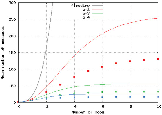 Let be the mean number of messages broadcast to update the location information of node i in the network. Node i is continuously broadcasting. Nodes at one hop from node i broadcast 1 in q. Nodes at two hops from node i broadcast 1 in (they receive 1 location update in q and forward them 1 in q), etc. As a result, can be written: