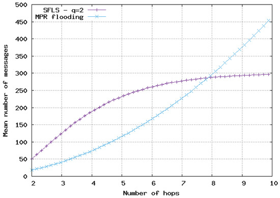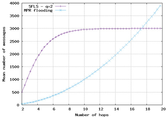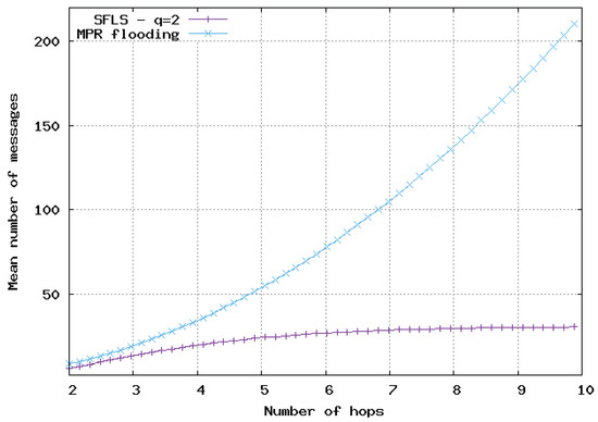 Mean number of messages sent for update with respect to number of hops in 2D homogeneous network, . Comparison of SFLS with MPR flooding.