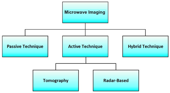 Microwave-based detection techniques offer several advantages over other detection methods such as being inexpensive, non-invasive, non-ionizing, and a comfortable form of treatment [13,20]. In addition, MI techniques provide higher sensitivity and the ability to detect small breast tumours as these techniques are based on the contrast of electrical properties between normal and tumourous breast tissues [13,20]. Such detection techniques are based on the hypothesis that the electrical properties, namely the permittivity and conductivity of malignant breast tissues, differ from those of healthy breast tissues within the microwave band [35,36]. In literature, there are three modalities that have been explored for microwave-based breast detection. As seen in Figure 2, these methods can be categorized as passive, hybrid, and active methods [35,36,37,38,39].