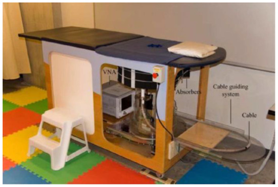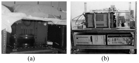 Prototype of the imaging system developed by Meaney et al. [44]. (a) View of the examination table. (b) View of the data acquisition system including the microwave source. Reprinted with permission from [44].