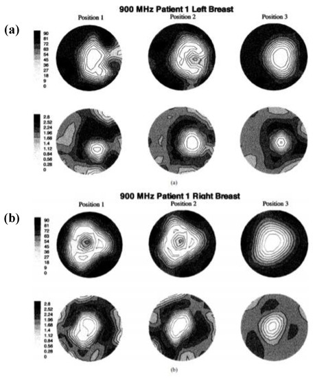 Recovered 900 MHz relative permittivity and conductivity images from Patient 1: (a) left breast and (b) right breast. Reprinted with permission from [44].