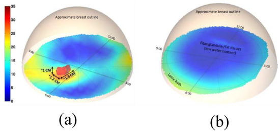 3D microwave tomographic permittivity images at 1300 MHz obtained from the system developed by Grzegorczyk et al. [67]. (a) The 3D structure of a tumour present in the right breast. (b) The 3D structure of a tumour-free left breast. Reprinted with permission from [67].