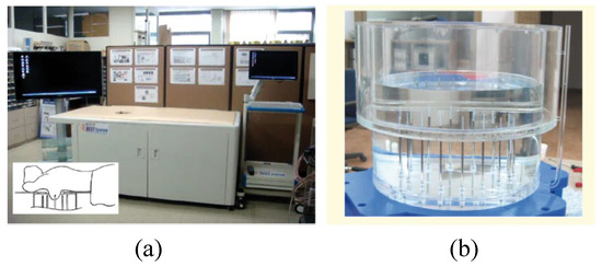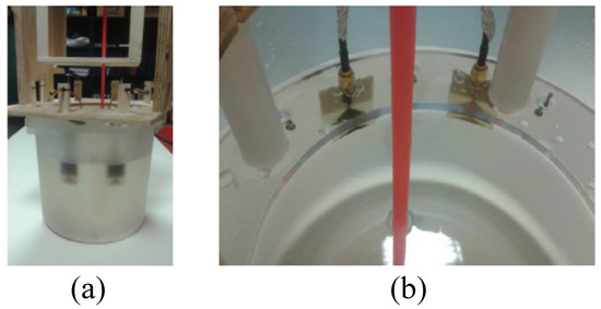 Photograph of a breast cancer detection system developed by Pagliari et al. [69]. (a) View of the antennas’ setup showing the breast holder consisting of a tank filled with a glycerine-water mixture. (b) Photograph of a vertically aligned cylinder representing the detection target. Reprinted with permission from [69].