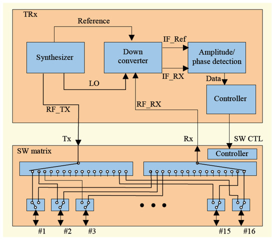 Son et al. developed a preclinical prototype MT system for breast cancer detection, as shown in Figure 7a [68]. In this system, a 16 element circular array was placed into an imaging bath having a matching liquid. Each antenna was used for signal transmission and reception over a frequency band ranging from 500 MHz to 3000 MHz. A matching liquid was used to fill the MI bath to reduce reflections from the breast surface, as shown in Figure 7b. The total number of transmit-receive data points was 240 (measurements were performed for each frequency at each imaging plane). The data acquisition unit used a programmable switch matrix, as shown in Figure 8 [68].