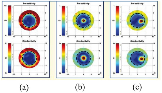 Reconstructed images at 1700 MHz for a breast phantom with a cylindrical 10 mm tumour. (a) Image of the breast without a tumour. (b) Image of the breast with a tumour positioned at the centre of the breast. (c) Image of the breast with a tumour positioned 30 mm right of centre. Marked big circles show the boundaries of the breast [68].