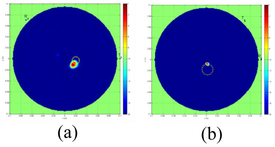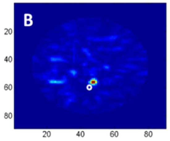 Reconstructed MT images obtained using the system developed by Pagliari et al. [69]. (a) A 12 mm tumour is indicated by the red spot inside a metallic cylinder breast phantom. (b) A 12 mm tumour is indicated by the red spot inside a dielectric cylinder breast phantom. Reprinted with permission from [69].