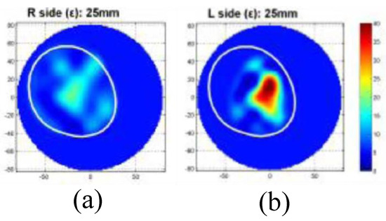 Reconstructed MT images obtained using the system developed by Jeon et al. [70]. (a) An image of the right tumour-free breast. (b) An image of the left breast, which indicates the presence of a 25 mm tumour. Reprinted with permission from [70].