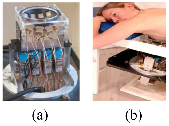 Prototype UWB frequency-domain radar-based MI system developed by Klemm et al. [76]. (a) View of the breast holder consisting of a conformal MI array, feed, and a switching system. (b) A photo of the prototype system setup for breast cancer detection showing a healthy female volunteer lying in a prone position. Reprinted with permission from [76].