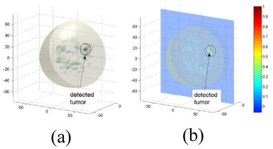 Clinical imaging results using a radar-based UWB microwave system developed by Klemm et al. [76]. (a) A 3D image. (b) A 2D image showing the presence of a tumour. Reprinted with permission from [76].