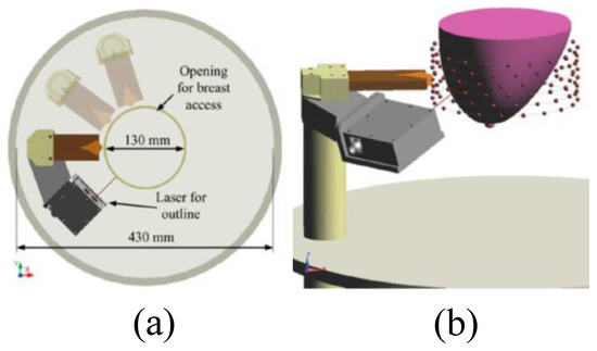 View of the radar-based MI system for breast cancer detection developed by Fear et al. [78]. (a) Top-down view of the antennas and laser setup. (b) Showing the breast holder consisting of a tank, laser, and antennas. Reprinted with permission from [78].