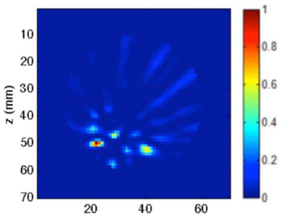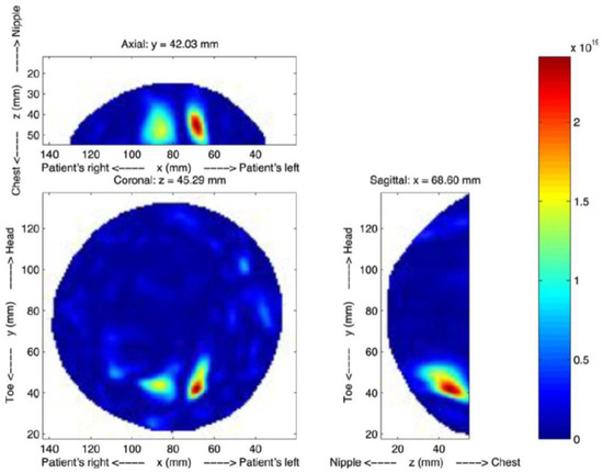 Reconstructed images for a breast slice taken at a depth of 6 mm from the chest wall obtained using the system developed by Porter et al. [83]. Reprinted with permission from [83].