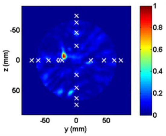 Reconstructed image of a breast phantom detection system developed by Porter et al. [80]. The tumour is indicated by the red spot; the x markers represent the positions of the antennas; and the diamond markers represent the actual location of the tumour centres. Reprinted with permission from [80].