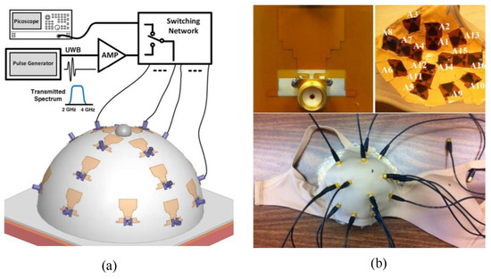 Microwave radar system for breast cancer detection developed by Porter et al. [83]. (a) A schematic of the microwave radar system setup. (b) A photograph showing the wearable prototype system. The top left photograph shows the connectorised monopole antenna. The top right photograph shows the antenna array inside the bra-cup with antennas’ numbers marked. The bottom photograph shows the outside of the bra and the cables that connect to the antennas. Reprinted with permission from [83].