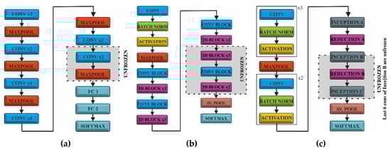 Architectures of the models used for facial emotion recognition (FER): (a) VGG; (b) ResNet50 and (c) Inception V3.