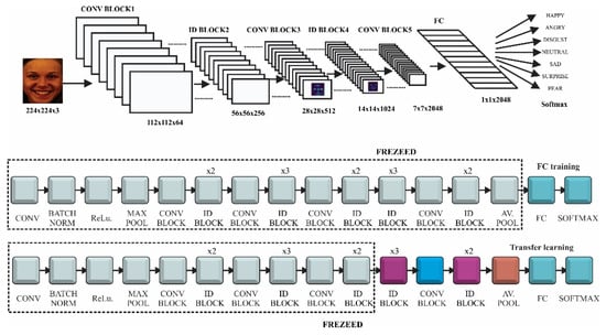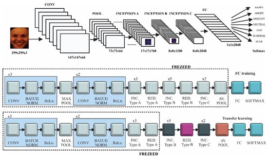 The CNN models used for FER were pretrained on the ImageNet database and could recognize objects from 1000 classes. We did not need a SSD or RPN architecture as the face localization was already achieved with face detection CNN. ImageNet did not provide a class related to face or humans but there were some other classes (e.g., t-shirt or bowtie) that helped the network to extract these kinds of features during the prelearning process. This is related to the fact that the network needs these features in order to classify emotions related to classes. Taking into account that only some bottleneck layers will be trained, we would use transfer learning and fine-tuning, as follows: in the first phase the fully connected layers of the pretrained model were replaced with two new randomly initialized FC layers that were able to classify the input images according to our dataset and classes. During this warm-up training all the convolutional layers were frozen allowing the gradient to back-propagate only through the new FC layers. In the second stage the last layers of the convolutional networks were unfrozen, where high-level representations were learned allowing the gradient to back-propagate through these layers but with a very small learning rate in order to allow small changes to the weights. The representation of the three CNN (VGG, ResNet and Inception V3) and the transfer learning approach is shown in Figure 1.