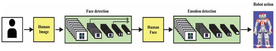 In terms of the human–robot interaction, the research is concentrated on different levels and implies, among others, the grasping configurations of robot dexterous hands using Dezert–Smarandache theory (DSmT) decision-making algorithms [36], developing advanced intelligent control systems for the upper limb [37,38,39,40,41] or other artificial intelligence techniques such as neutrosophic logic [36,41,42], extenics control [43,44] and fuzzy dynamic modeling [45,46,47], applicable for the human–robot interaction with feedback through facial expressions recognition. The research in this paper is focused on developing an AI based computer vision system to achieve the communication human–NAO robot aiming the future researches to develop an end-to-end pipeline system with advanced intelligent control using feedback from the interaction between a human and NAO robot.