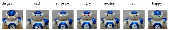 NAO is a humanoid robot developed by Aldebaran (Softbank Robotics), it has a height of 57 cm, weighs 4.3 kg and is widely used in the research and education due to its good performances, small size, affordable price and the wide range of sensors it is equipped with. Since the scripts can be developed in several programming languages and can be compiled both locally (on the robot) and remotely, NAO can be used in various applications. In order to achieve a human–robot interaction NAO’s top front camera was used for taking pictures or videos of the person in front and NAO’s voice module together with eye and ear LEDs for outputting robot emotion. NAO has two identical RGB video cameras located in the forehead, which provide a 640 × 480 resolution at 30 frames per second. The field of view is 72.6°DFOV with a focus range between 30 cm and infinity [54]. Eye and foot LEDs are RGB full color, so it is possible to combine the three primary colors (red, green and blue) in order to obtain different colors. This feature will be used to associate an emotion to one color: happy is green, red is angry, blue is sad, disgust is yellow, neutral is black, surprise in white and fear is orange (Figure 5). The intensity of the color will be adjusted depending on the probability of emotion detection.
