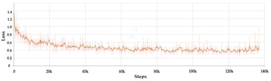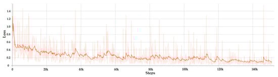 The loss variation of Faster R-CNN is presented in Figure 6. It can be seen that the loss dropped very quickly. This happened because the complex architecture of R-CNN, which is a combination of ResNet and Inception models, increased the training accuracy. Another parameter that artificially boosted the accuracy of the network was the number of images in the batch. In our case there was only one image per batch due to the limitations of the GPU. Since the gradient descent was applied to every batch, not to the entire dataset, it was normal to have a rapid drop and small loss overall. After the rapid drop to a value of 0.4 in the first 5k steps, the loss decreased slowly until it started to converge at around 60k steps with the value of 0.25. The accuracy of Faster R-CNN model was 97.8% using the Pascal visual object class (VOC) evaluation metrics.