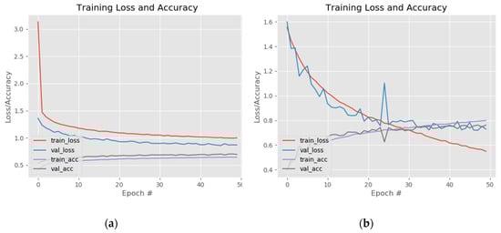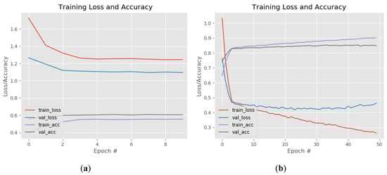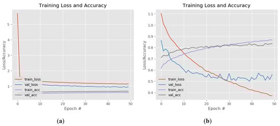 The best results were achieved for batch size: 32, Adam optimizer, learning rate—0.0001 and unfreezing the layers starting from the fifth convolution of the first Inception Block-type B. This model reached a training accuracy 0.81 (81%) and 0.78 (78%) when the training was stopped, after 50 epoch (Figure 10b), due to over fitting.