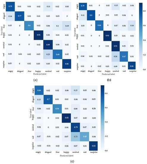 The confusion matrix for FER predictions of the three architectures is presented in Figure 11. The network with the best overall results, from the confusion matrix perspective, was also ResNet (Figure 11b), followed by the VGG (Figure 11a) and InceptionV3 (Figure 11c). The first thing to notice was that the class with the highest score was the “happy” class regardless of the network model. There were two crucial factors that enabled such a good prediction: high variance and large dataset, with the first being the most important. Training samples play an important role for learning a complex future but the variance was determinant when it came to highlighting crucial features. This can be seen from the fact that the happy class is not the biggest in the training samples, being overtaken by the neutral class. Although it had the largest share of the dataset, the “neutral” class failed to generalize as well as others. The same thing when comparing angry, sad and surprise classes. The classes shared the same proportion from the dataset but the accuracy was different.